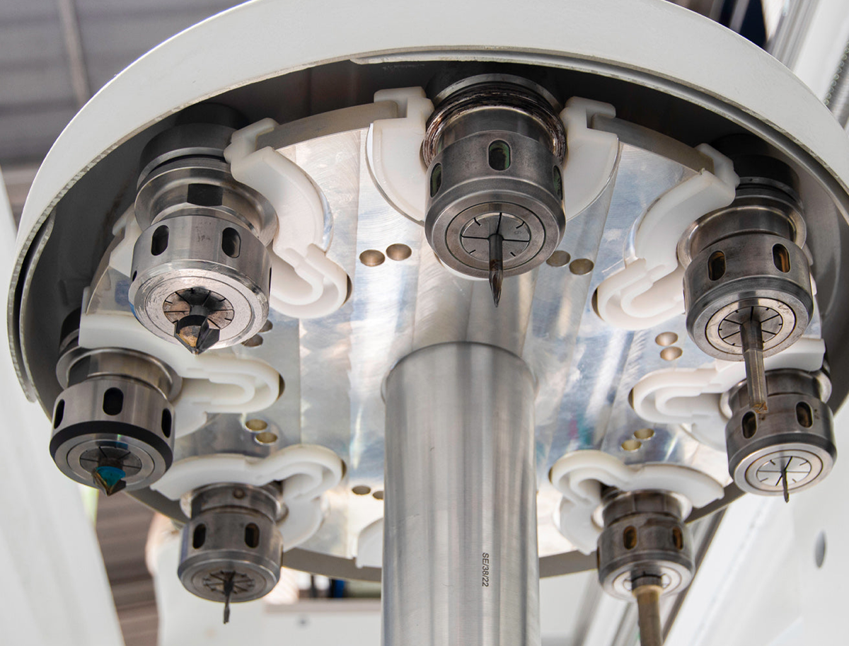 การเจาะและการแปรรูปชิ้นงาน โดยใช้ศูนย์เครื่องจักรกล CNC HOMAG CENTRATEQ เพื่อความแม่นยำสูง รองรับเฟอร์นิเจอร์สั่งทำที่ซับซ้อน ด้วยเทคโนโลยี Pendulum Feature ช่วยให้สามารถประมวลผลได้มากถึง 4 ชิ้นงานต่อรอบ ความเร็วในการผลิตแบบ Mass Production และการใช้ระบบ CAD/CAM ผลิตโดยตรง รับประกันตำแหน่งรูแม่นยำ 100% ลดปัญหาการติดตั้งหน้างาน