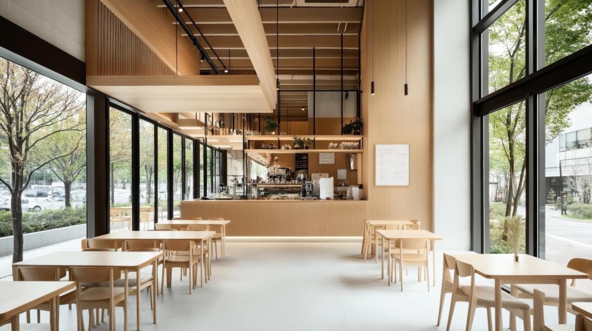 ร้านกาแฟ/คาเฟ่สไตล์ไม้และปูนThe Minimalist Brew คือตัวอย่างของ ออกแบบภายใน เชิงพาณิชย์ที่ใช้พลังของ นวัตกรรมวัสดุ เพื่อสร้างบรรยากาศที่ผ่อนคลายและเป็นมิตร